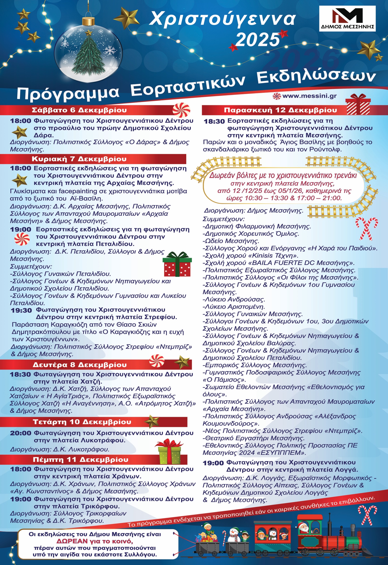 11:30 Δημιουργικά εργαστήρια με χριστουγεννιάτικες κατασκευές και στολισμός δέντρων ευχών στην κεντρική πλατεία Μεσσήνης.